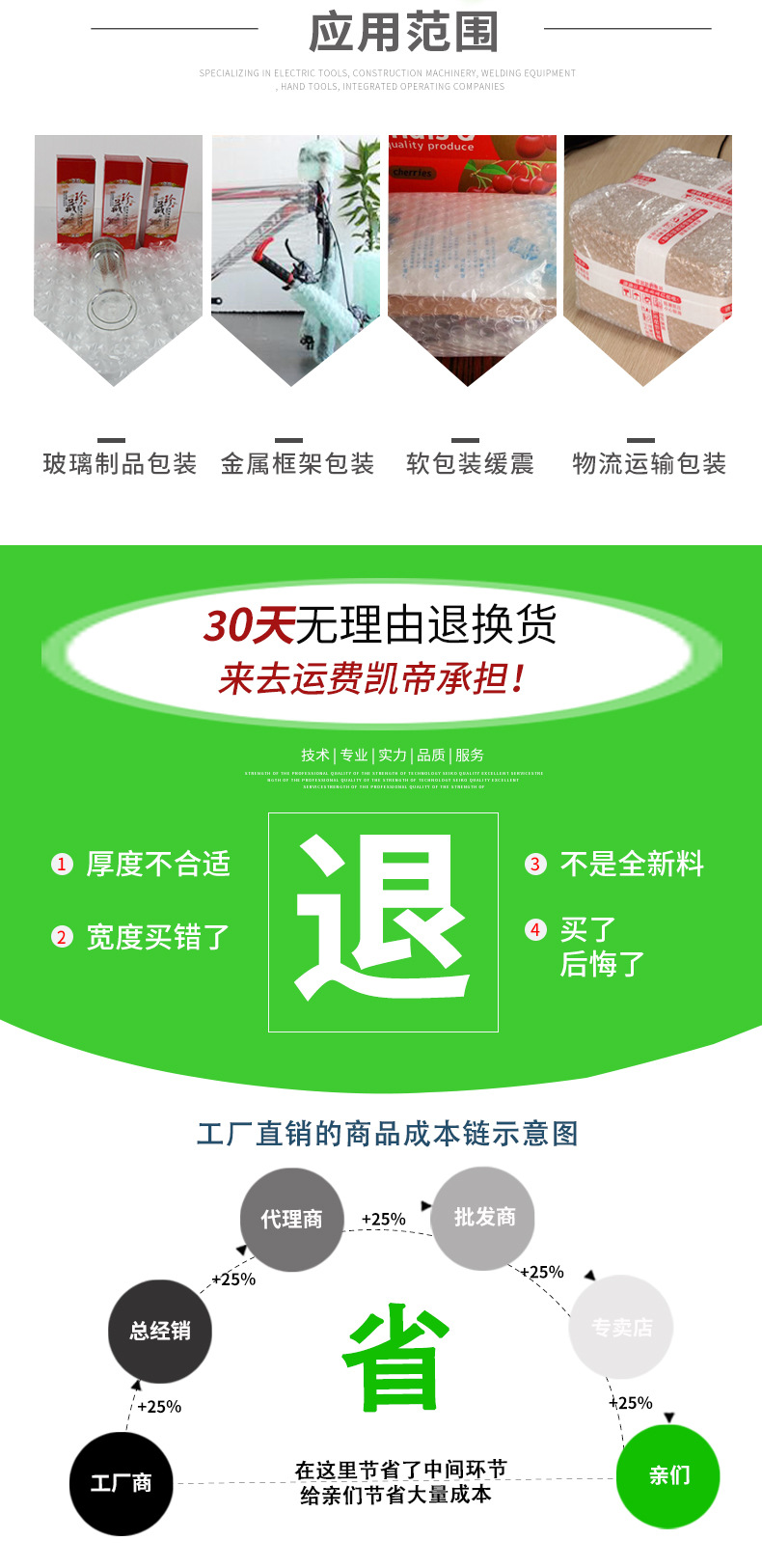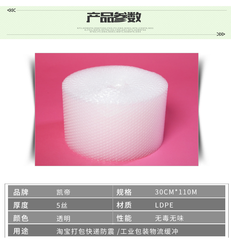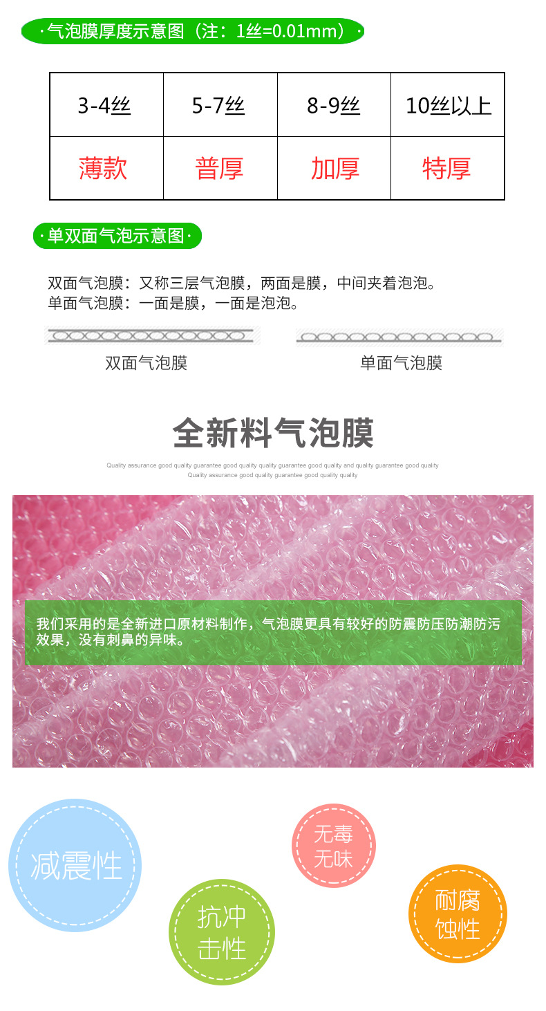 - 雙層大泡加厚氣泡膜,泡泡直徑20mm以上,泡高達6mm,泡泡內含有更多空氣,防震效果更好。我公司引進先進雙層大泡氣泡膜機組,生產(chǎn)的三層大泡加厚氣泡膜,廣泛用于電子商務、物流快遞、汽車零部件、電子電器、玻璃陶瓷、家具家私、食品飲料等行業(yè)的抗震性緩沖包裝。